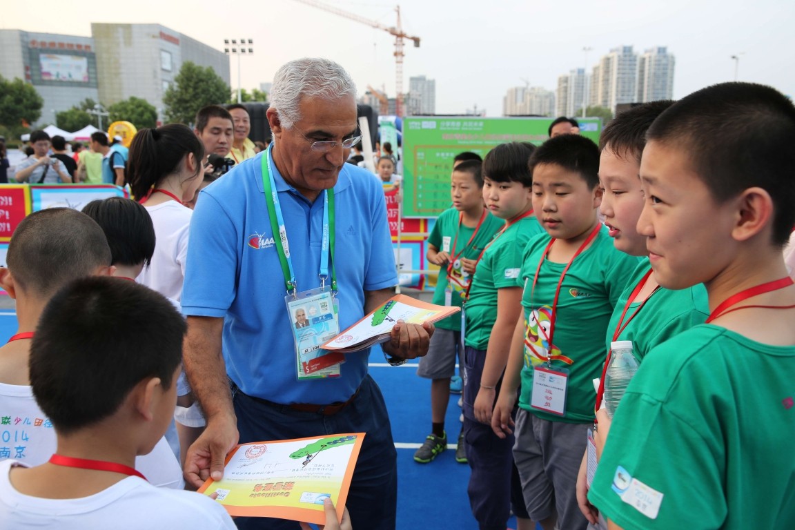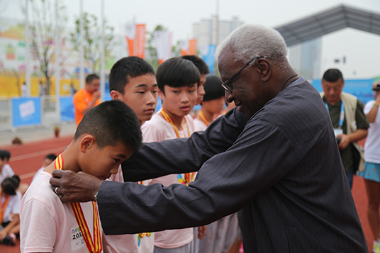 国际田联主席拉明-迪亚克为冠军队颁奖