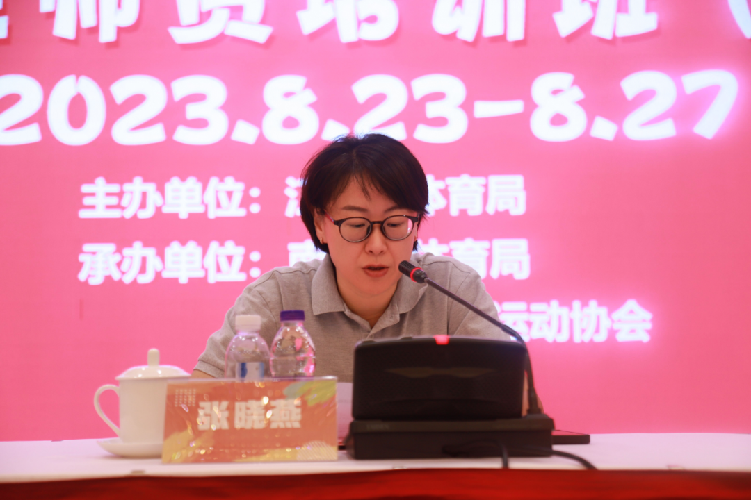 江苏省体育局青少处副处长 张晓燕做开班动员讲话,张处长表示推动趣味田径运动,培养幼儿对趣味田径的兴趣,对落实全民健身发展根基、培养竞技体育后备人才具有基础作用。希望在本期的培训班中,各位园长、老师能充分认识到趣味田径对于幼儿身心健康成长的重要意义,掌握正确的方法。让幼儿阶段的孩子爱玩趣味田径、会玩趣味田径、能玩趣味田径、玩好趣味田径,为使幼儿成为未来合格的建设者和接班人,打下坚实而稳固的体质健康基础。