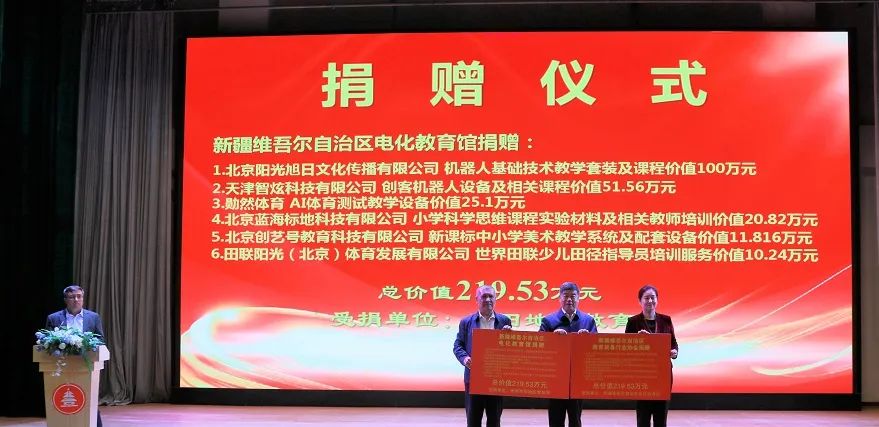 田联阳光(北京)体育发展有限公司向新疆维吾尔自治区电化教育馆捐赠了价值10.24万元的世界田联少儿田径指导员培训服务。并在会上举行了捐赠仪式。