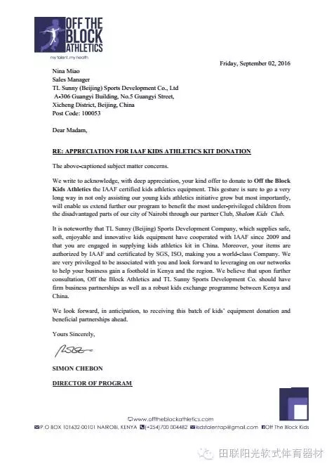 9月2日,田联阳光(北京)体育发展有限公司收到了来自肯尼亚OFF the Block Kids Athletics 公司的一封感谢函,函中,OFF the Block Kids Athletics 公司对田联阳光捐赠体育器材的义举深表感谢,并希望以收到捐赠的器材作为双方合作受益的起点,进一步加深拓宽双方的商业合作。