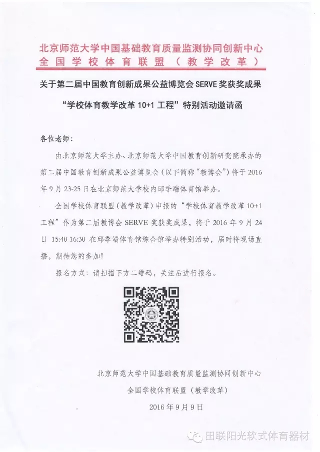 2016年9月23日-9月27日期间,“第二届中国教育创新成果公益博览会”和“北京市第七届全国学校体育联盟(教学改革)现场展示及研讨会”将先后于北京师范大学举办,国际田联少儿趣味田径项目作为“高参小”重点推广项目及“一校一品”体育特色将于活动现场举行集中展示及体验活动。
