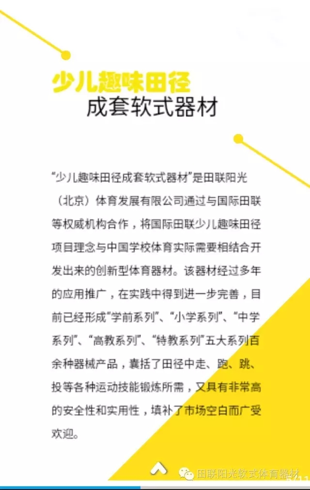 田联阳光(北京)体育发展有限公司将携教育部最新颁布的《中小学体育器材设施配备标准》要求配备器材“少儿趣味田径成套软式器材”亮相第71届中国教育装备展 ,期待您的莅临参观!